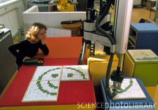 - The resulting design informs a Fanuc robot arm which picks up 1-inch (or half-inch) tiles of various colors and places them on a industry-standard polymer backing.